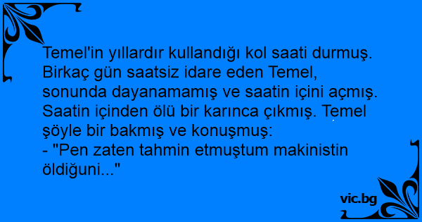 Temel'in yıllardır kullandığı kol saati durmuş. Birkaç gün saatsiz idare eden Temel, sonunda dayanamamış ve saatin içini açmış. Saatin içinden ölü bir karınca çıkmış. Temel şöyle bir bakmış ve konuşmuş: