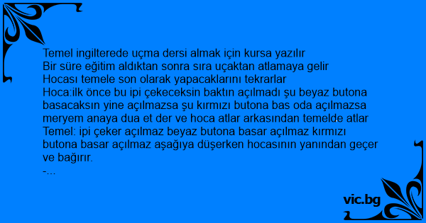 Temel: ipi çeker açılmaz beyaz butona basar açılmaz kırmızı butona basar açılmaz aşağıya düşerken hocasının yanından geçer ve bağırır.