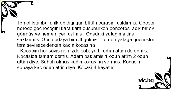 - Kocacim her sevismemizde sobaya bi odun attim de demis. Kocasida tamam demis. Adam baslamis 1 odun attim 2 odun attim diye. Sabah olmus kadin kocasina sormus: Kocacim sobaya kac odun attin diye. Kocasi 4 hayatim demis