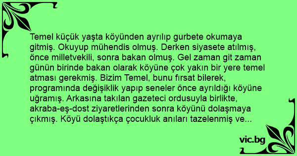 Temel küçük yaşta köyünden ayrılıp gurbete okumaya gitmiş. Okuyup mühendis olmuş. Derken siyasete atılmış, önce milletvekili, sonra bakan olmuş. Gel zaman giт zaman günün birinde bakan olarak köyüne çok yakın bir yere temel atması gerekmiş. Bizim Temel, bunu fırsat bilerek, programında değişiklik yapıp seneler önce ayrıldığı köyüne uğramış. Arkasına takılan gazeteci ordusuyla birlikte, akraba-eş-dost ziyaretlerinden sonra köyünü dolaşmaya çıkmış. Köyü dolaştıkça çocukluk anıları tazelenmiş ve başlamış anlatmaya: