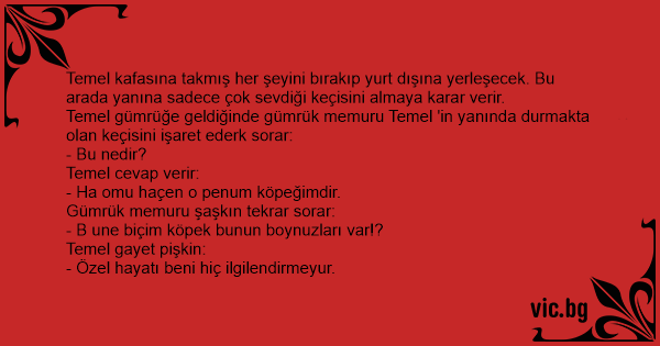Temel gümrüğe geldiğinde gümrük memuru Temel 'in yanında durmakta olan keçisini işaret ederk sorar: