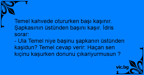 - Ula Temel niye başinu şapkanın üstünden kaşidun? Temel cevap verir: Haçan sen kıçinu kaşurken donunu çıkariyurmusun ?