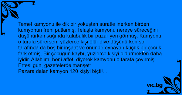 Temel kamyonu ile dik bir yokuştan süratle inerken birden kamyonun freni patlamış. Telaşla kamyonu nereye süreceğini düşünürken sağında kalabalık bir pazar yeri görmüş. Kamyonu o tarafa sürersem yüzlerce kişi ölür diye düşünürken sol tarafında da boş bir inşaat ve önünde oynayan küçük bir çocuk fark etmiş. Bir çocuğun kaybı, yüzlerce kişiyi öldürmekten daha iyidir. Allah'ım, beni affet, diyerek kamyonu o tarafa çevirmiş.
