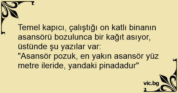 Temel kapıcı, çalıştığı on katlı binanın asansörü bozulunca bir kağıt asıyor, üstünde şu yazılar var: