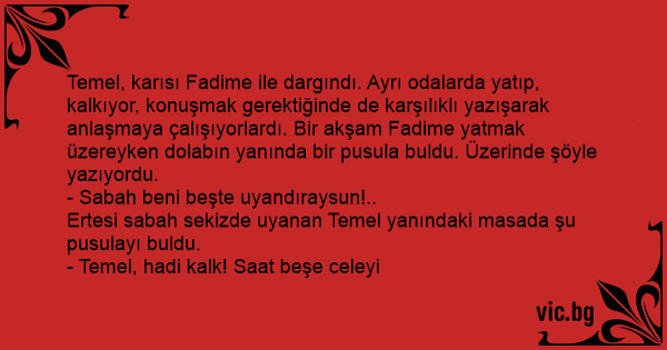 Temel, karısı Fadime ile dargındı. Ayrı odalarda yatıp, kalkıyor, konuşmak gerektiğinde de karşılıklı yazışarak anlaşmaya çalışıyorlardı. Bir akşam Fadime yatmak üzereyken dolabın yanında bir pusula buldu. Üzerinde şöyle yazıyordu.