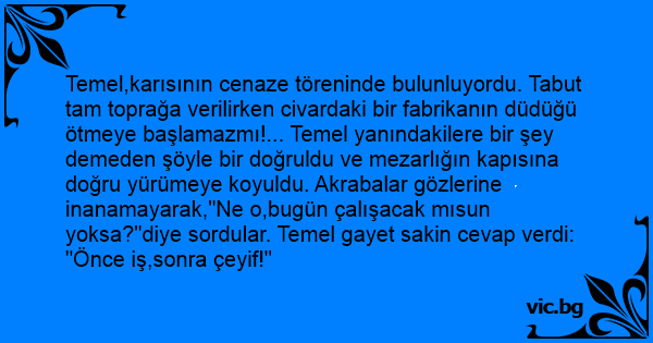 Temel,karısının cenaze töreninde bulunluyordu. Tabut tam toprağa verilirken civardaki bir fabrikanın düdüğü ötmeye başlamazmı!... Temel yanındakilere bir şey demeden şöyle bir doğruldu ve mezarlığın kapısına doğru yürümeye koyuldu. Akrabalar gözlerine inanamayarak,"Ne o,bugün çalışacak mısun yoksa?"diye sordular. Temel gayet sakin cevap verdi:
