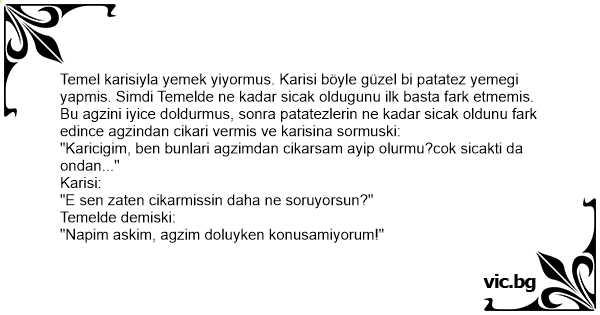 Temel karisiyla yemek yiyormus. Karisi böyle güzel bi patatez yemegi yapmis. Simdi Temelde ne kadar sicak oldugunu ilk basta fark etmemis. Bu agzini iyice doldurmus, sonra patatezlerin ne kadar sicak oldunu fark edince agzindan cikari vermis ve karisina sormuski: