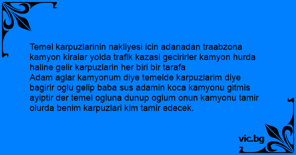 Adam aglar kamyonum diye temelde karpuzlarim diye bagirir oglu gelip baba sus adamin koca kamyonu gitmis ayiptir der temel ogluna dunup oglum onun kamyonu tamir olurda benim karpuzlari kim tamir edecek.