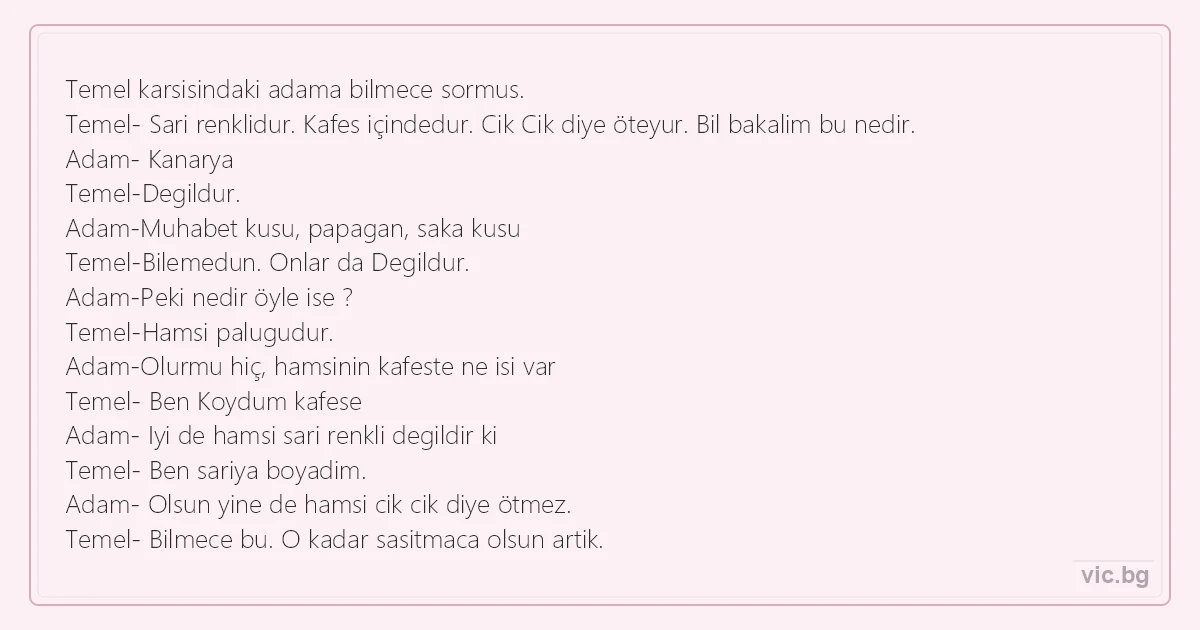 Temel karsisindaki adama bilmece sormus. Temel- Sari renklidur. Kafes içindedur. Cik Cik diye öteyur. Bil bakalim bu nedir. Adam- Kanarya Temel-Degildur. Adam-Muhabet kusu, papagan, saka kusu Temel-Bilemedun. Onlar da Degildur. Adam-Peki nedir öyle ise ? Temel-Hamsi palugudur. Adam-Olurmu hiç, hamsinin kafeste ne isi var Temel- Ben Koydum kafese Adam- Iyi de hamsi sari renkli degildir ki Temel- Ben sariya boyadim. Adam- Olsun yine de hamsi cik cik diye ötmez. Temel- Bilmece bu. O kadar sasitmaca olsun artik.