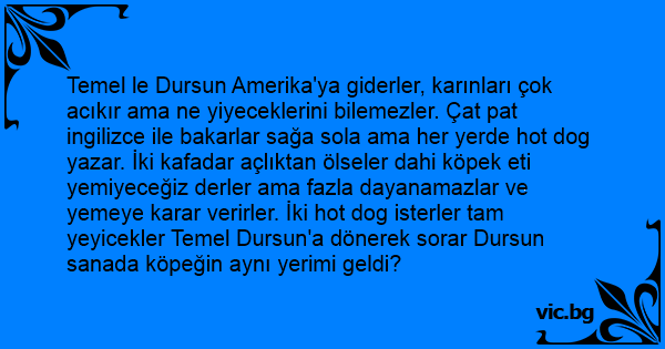 Temel le Dursun Amerika'ya giderler, karınları çok acıkır ama ne yiyeceklerini bilemezler. Çat pat ingilizce ile bakarlar sağa sola ama her yerde hot dog yazar. İki kafadar açlıktan ölseler dahi köpek eti yemiyeceğiz derler ama fazla dayanamazlar ve yemeye karar verirler. İki hot dog isterler tam yeyicekler Temel Dursun'a dönerek sorar Dursun sanada köpeğin aynı yerimi geldi?