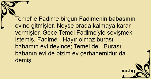 Temel'le Fadime birgün Fadimenin babasının evine gitmişler. Neyse orada kalmaya karar vermişler. Gece Temel Fadime'yle sevişmek istemiş. Fadime - Hayır olmaz burası babamın evi deyince; Temel de - Burası babanın evi de bizim ev çerhanemidur da demiş.