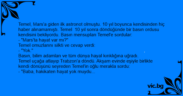 Temel, Mars'a giden ilk astronot olmuştu. 10 yıl boyunca kendisinden hiç haber alınamamıştı. Temel 10 yıl sonra döndüğünde bir basın ordusu kendisini bekliyordu. Basın mensupları Temel'e sordular: