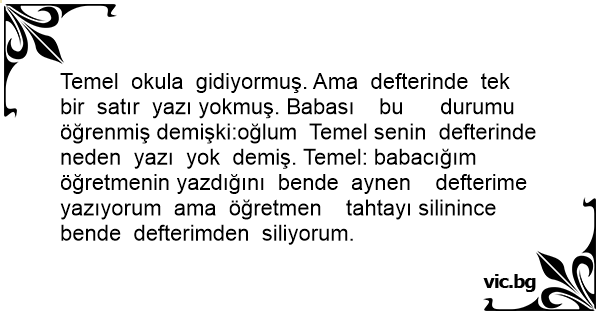 Temel okula gidiyormuş. Ama defterinde tek bir satır yazı yokmuş. Babası bu durumu öğrenmiş demişki:oğlum Temel senin defterinde neden yazı yok demiş. Temel: babacığım öğretmenin yazdığını bende aynen defterime yazıyorum ama öğretmen tahtayı silinince bende defterimden siliyorum.