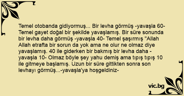Temel otobanda gidiyormuş... Bir levha görmüş -yavaşla 60- Temel gayet doğal bir şekilde yavaşlamış. Bir süre sonunda bir levha daha görmüş -yavaşla 40- Temel şaşırmış "Allah Allah etrafta bir sorun da yok ama ne olur ne olmaz diye yavaşlamış. 40 ile giderken bir bakmış bir levha daha -yavaşla 10- Olmaz böyle şey yahu demiş ama tıpış tıpış 10 ile gitmeye başlamış. Uzun bir süre gittikten sonra son levhayı görmüş...-yavaşla'ya hoşgeldiniz-
