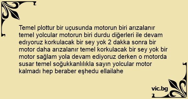 Temel plottur bir uçusunda motorun biri arızalanır temel yolcular motorun biri durdu diğerleri ile devam edıyoruz korkulacak bir sey yok 2 dakka sonra bir motor daha arızalanır temel korkulacak bir sey yok bir motor sağlam yola devam ediyoruz derken o motorda susar temel soğukkanlılıkla sayın yolcular motor kalmadı hep beraber eşhedu ellailahe