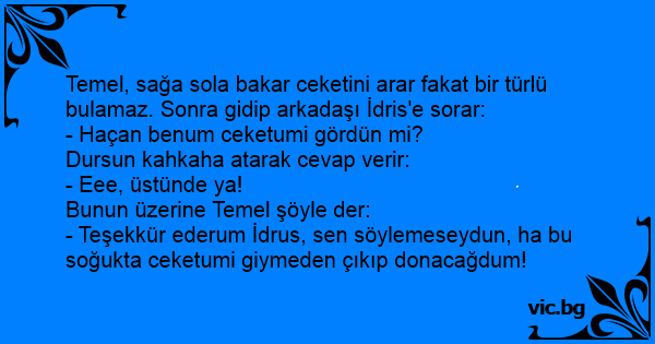 - Teşekkür ederum İdrus, sen söylemeseydun, ha bu soğukta ceketumi giymeden çıkıp donacağdum!