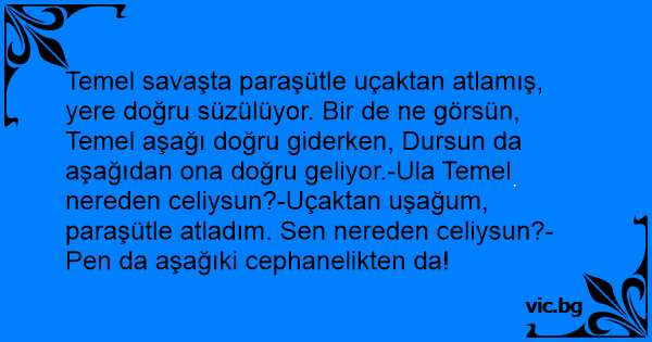 Temel savaşta paraşütle uçaktan atlamış, yere doğru süzülüyor. Bir de ne görsün, Temel aşağı doğru giderken, Dursun da aşağıdan ona doğru geliyor.-Ula Temel nereden celiysun?-Uçaktan uşağum, paraşütle atladım. Sen nereden celiysun?-Pen da aşağıki cephanelikten da!