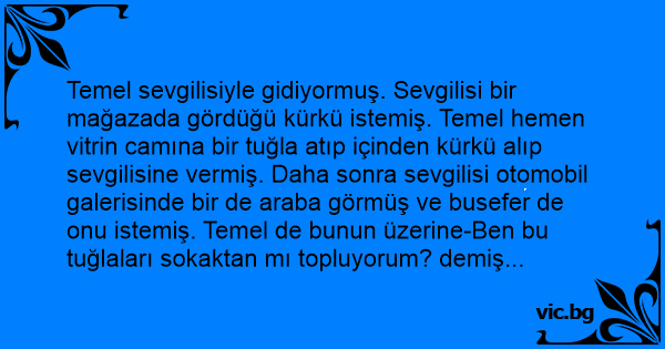 Temel sevgilisiyle gidiyormuş. Sevgilisi bir mağazada gördüğü kürkü istemiş. Temel hemen vitrin camına bir tuğla atıp içinden kürkü alıp sevgilisine vermiş. Daha sonra sevgilisi otomobil galerisinde bir de araba görmüş ve busefer de onu istemiş. Temel de bunun üzerine-Ben bu tuğlaları sokaktan mı topluyorum? demiş...