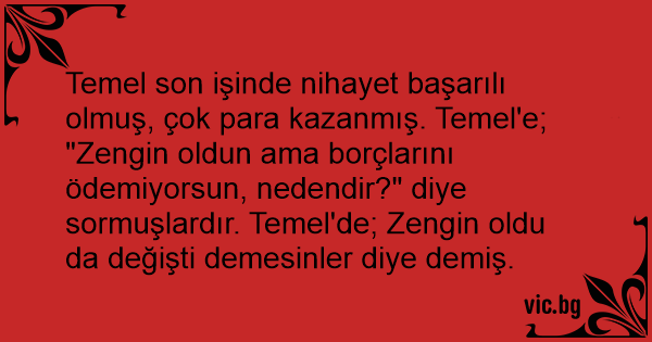 Temel son işinde nihayet başarılı olmuş, çok para kazanmış. Temel'e; "Zengin oldun ama borçlarını ödemiyorsun, nedendir?" diye sormuşlardır. Temel'de; Zengin oldu da değişti demesinler diye demiş.