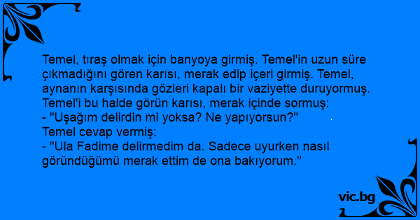 Temel, tıraş olmak için banyoya girmiş. Temel'in uzun süre çıkmadığını gören karısı, merak edip içeri girmiş. Temel, aynanın karşısında gözleri kapalı bir vaziyette duruyormuş. Temel'i bu halde görün karısı, merak içinde sormuş:
