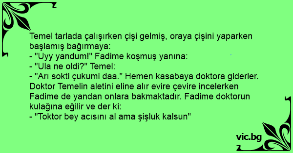 - "Arı sokti çukumi daa." Hemen kasabaya doktora giderler. Doktor Temelin aletini eline alır evire çevire incelerken Fadime de yandan onlara bakmaktadır. Fadime doktorun kulağına eğilir ve der ki: