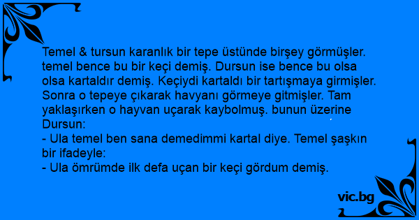 Temel & tursun karanlık bir tepe üstünde birşey görmüşler. temel bence bu bir keçi demiş. Dursun ise bence bu olsa olsa kartaldır demiş. Keçiydi kartaldı bir tartışmaya girmişler. Sonra o tepeye çıkarak havyanı görmeye gitmişler. Tam yaklaşırken o hayvan uçarak kaybolmuş. bunun üzerine Dursun: