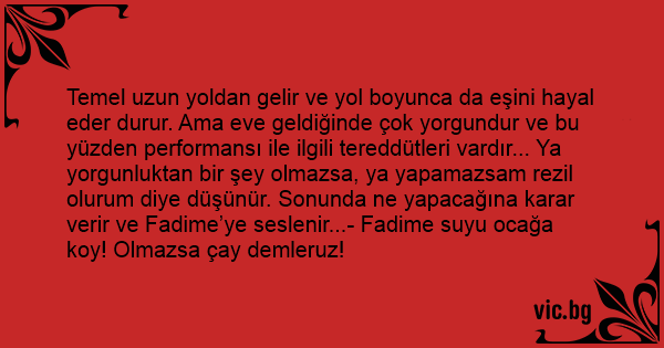Temel uzun yoldan gelir ve yol boyunca da eşini hayal eder durur. Ama eve geldiğinde çok yorgundur ve bu yüzden performansı ile ilgili tereddütleri vardır... Ya yorgunluktan bir şey olmazsa, ya yapamazsam rezil olurum diye düşünür. Sonunda ne yapacağına karar verir ve Fadime’ye seslenir...- Fadime suyu ocağa koy! Olmazsa çay demleruz!