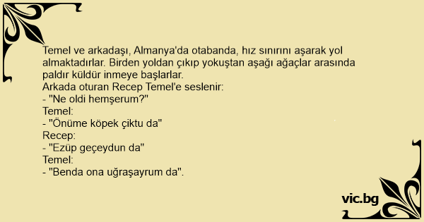 Temel ve arkadaşı, Almanya'da otabanda, hız sınırını aşarak yol almaktadırlar. Birden yoldan çıkıp yokuştan aşağı ağaçlar arasında paldır küldür inmeye başlarlar.