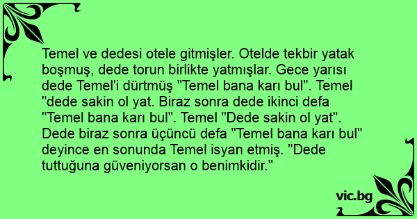 Temel ve dedesi otele gitmişler. Otelde tekbir yatak boşmuş, dede torun birlikte yatmışlar. Gece yarısı dede Temel'i dürtmüş "Temel bana karı bul". Temel "dede sakin ol yat. Biraz sonra dede ikinci defa "Temel bana karı bul". Temel "Dede sakin ol yat". Dede biraz sonra üçüncü defa "Temel bana karı bul" deyince en sonunda Temel isyan etmiş. "Dede tuttuğuna güveniyorsan o benimkidir."