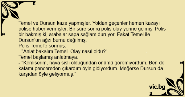 Temel ve Dursun kaza yapmışlar. Yoldan geçenler hemen kazayı polise haber vermişler. Bir süre sonra polis olay yerine gelmiş. Polis bir bakmış ki, arabalar sapa sağlam duruyor. Fakat Temel ile Dursun'un ağzı burnu dağılmış.