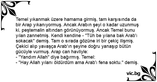 Temel yıkanmak üzere hamama girmiş, tam karşısında da bir Arap yıkanıyormuş. Ancak Arabın şeyi o kadar uzunmuş ki, peştemalin altından görünüyormuş. Ancak Temel bunu yılan zannetmiş. Kendi kendine - "Tüh be yılana bak Arab'ı sokacak" demiş. Tam o sırada gözüne iri bir çekiç ilişmiş. Çekici alıp yavaşça Arab'ın şeyine doğru yanaşıp bütün gücüyle vurmuş. Arap can havliyle: