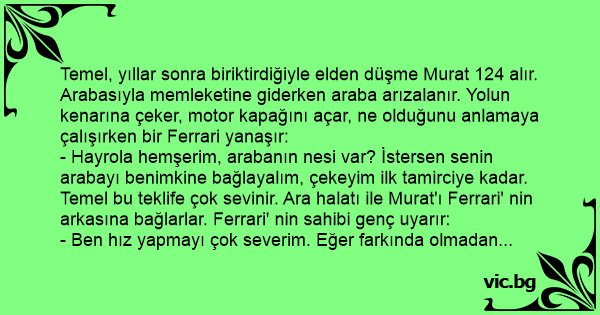 - Komiserim, şehrin kuzeyindeki yolda trafik güvenliği tehdit altında!!! 3 araç yarış yapıyor. Ferrari ile Lamborghini saatte 300 km hızla yan yana gidiyorlar, arkadan da Murat 124 onları geçmek için 10 dakikadır selektör yapıp yol istiyor!