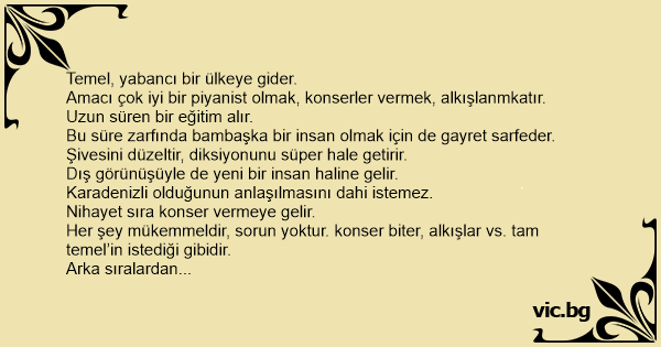 - Uşağum, piyanonun başına geçinca tabureyi piyanoya çekmedun, piyanoyu kendune çektun da!