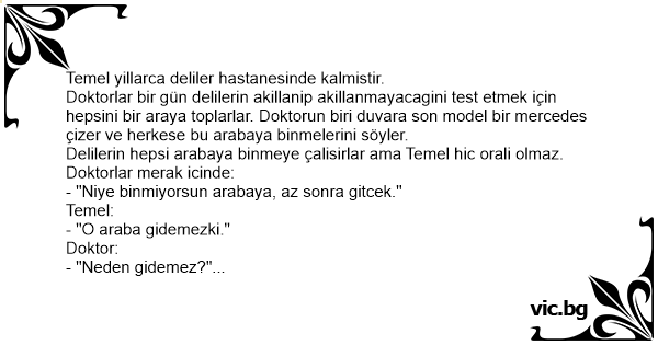 Doktorlar bir gün delilerin akillanip akillanmayacagini test etmek için hepsini bir araya toplarlar. Doktorun biri duvara son model bir mercedes çizer ve herkese bu arabaya binmelerini söyler.