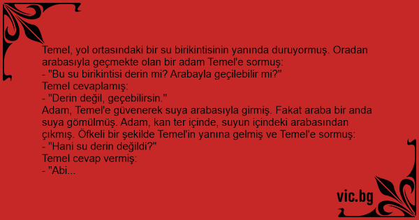 Adam, Temel'e güvenerek suya arabasıyla girmiş. Fakat araba bir anda suya gömülmüş. Adam, kan ter içinde, suyun içindeki arabasından çıkmış. Öfkeli bir şekilde Temel'in yanına gelmiş ve Temel'e sormuş: