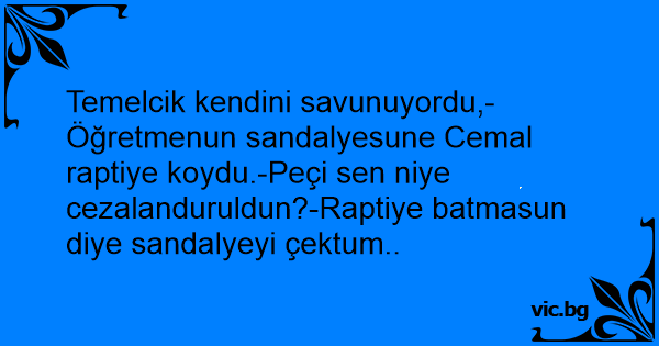 Temelcik kendini savunuyordu,-Öğretmenun sandalyesune Cemal raptiye koydu.-Peçi sen niye cezalanduruldun?-Raptiye batmasun diye sandalyeyi çektum..
