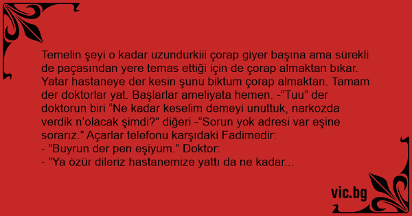 Temelin şeyi o kadar uzundurkiii çorap giyer başına ama sürekli de paçasından yere temas ettiği için de çorap almaktan bıkar. Yatar hastaneye der kesin şunu biktum çorap almaktan. Tamam der doktorlar yat. Başlarlar ameliyata hemen. -”Tuu” der doktorun biri “Ne kadar keselim demeyi unuttuk, narkozda verdik n’olacak şimdi?” diğeri -”Sorun yok adresi var eşine sorarız.” Açarlar telefonu karşıdaki Fadimedir: