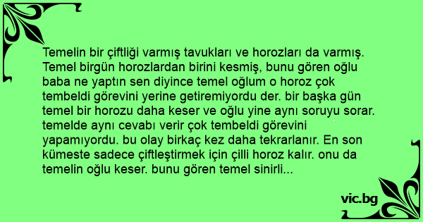 Temelin bir çiftliği varmış tavukları ve horozları da varmış. Temel birgün horozlardan birini kesmiş, bunu gören oğlu baba ne yaptın sen diyince temel oğlum o horoz çok tembeldi görevini yerine getiremiyordu der. bir başka gün temel bir horozu daha keser ve oğlu yine aynı soruyu sorar. temelde aynı cevabı verir çok tembeldi görevini yapamıyordu. bu olay birkaç kez daha tekrarlanır. En son kümeste sadece çiftleştirmek için çilli horoz kalır. onu da temelin oğlu keser. bunu gören temel sinirli bir şekilde sorar. ne yaptın oğlum se kalan tek horozu kestin. oglu cevap verir. baba en tembel horoz buydu görevini yapamıyordu hep kendisini tavuklara taşıtıyordu.