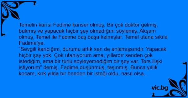 “Sevgili karıcığım, durumu artık sen de anlamışsındır. Yapacak hiçbir şey yok. Çok utanıyorum ama, yıllardır senden çok istediğim, ama bir türlü söyleyemediğim bir şey var. Ters ilişki istiyorum” demiş. Fadime düşünmüş, taşınmış. Bunca yıllık kocam, kırk yılda bir benden bir isteği oldu, nasıl olsa öleceğim diye düşünmüş ve kabul etmiş. O akşam yapmışlar. Ertesi gün Temel işe gitmiş, akşam eve dönünce bir de ne görsün, Fadime iyileşmiş, hiçbir şeyi kalmamış, evi silmiş, süpürmüş. Çok sevinmişler. Ancak birkaç saat sonra Temel başlamış kara kara düşünmeye. Fadime sormuş: