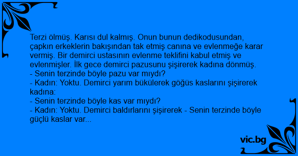 Terzi ölmüş. Karısı dul kalmış. Onun bunun dedikodusundan, çapkın erkeklerin bakışından tak etmiş canına ve evlenmeğe karar vermiş. Bir demirci ustasının evlenme teklifini kabul etmiş ve evlenmişler. İlk gece demirci pazusunu şişirerek kadına dönmüş.