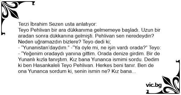 - “Yeğenim oradaydı yanına gittim. Orada denize girdim. Bir de Yunanlı kızla tanıştım. Kız bana Yunanca ismimi sordu. Dedim ki ben Hasankaleli Teyo Pehlivan. Herkes beni tanır. Ben de ona Yunanca sordum ki, senin ismin ne? Kız bana dedi ki, Benim adım Hadice!” -“Ula Teyo, orada Hatice ne arar?” -“Niye ola oğlum aralar da bizim değilmiydi?”