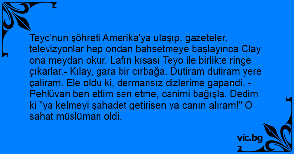 Teyo'nun şöhreti Amerika'ya ulaşıp, gazeteler, televizyonlar hep ondan bahsetmeye başlayınca Clay ona meydan okur. Lafın kısası Teyo ile birlikte ringe çıkarlar.- Kılay, gara bir cırbağa. Dutiram dutiram yere çaliram. Ele oldu ki, dermansız dizlerime gapandi. - Pehlüvan ben ettim sen etme, canimi bağışla. Dedim ki "ya kelmeyi şahadet getirisen ya canın alıram!" O sahat müslüman oldi.