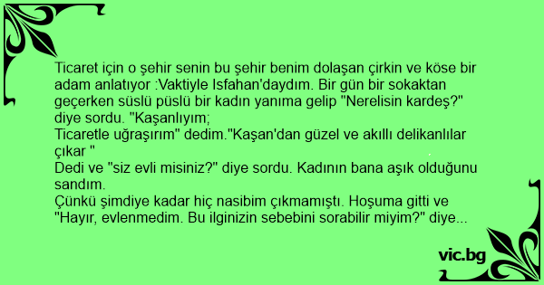 Ticaret için o şehir senin bu şehir benim dolaşan çirkin ve köse bir adam anlatıyor :Vaktiyle Isfahan'daydım. Bir gün bir sokaktan geçerken süslü püslü bir kadın yanıma gelip "Nerelisin kardeş?" diye sordu. "Kaşanlıyım;