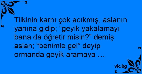 Tilkinin karnı çok acıkmış, aslanın yanına gidip; “geyik yakalamayı bana da öğretir misin?” demiş aslan; “benimle gel” deyip ormanda geyik aramaya …