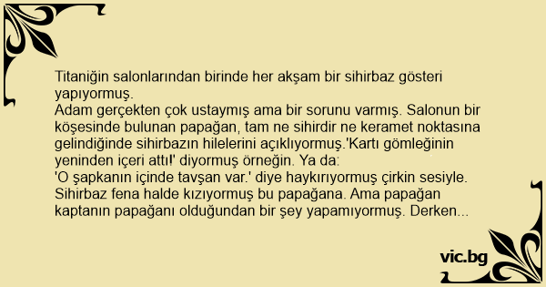 Adam gerçekten çok ustaymış ama bir sorunu varmış. Salonun bir köşesinde bulunan papağan, tam ne sihirdir ne keramet noktasına gelindiğinde sihirbazın hilelerini açıklıyormuş.'Kartı gömleğinin yeninden içeri attı!' diyormuş örneğin. Ya da: