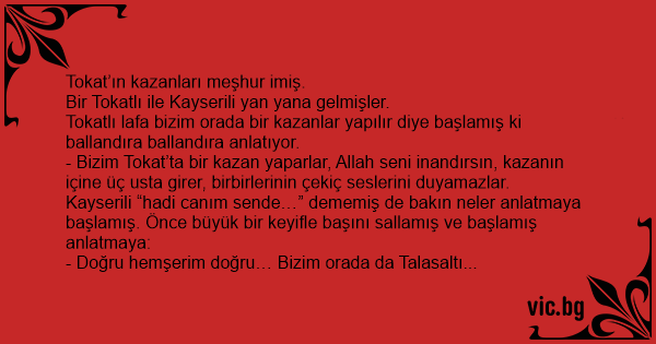 - Doğru hemşerim doğru… Bizim orada da Talasaltı denen bir yer var. Allah seni inandırsın, öyle bereketli topraklarda öyle büyük kabak yetiştirirler ki, kabağın büyüklüğünden Ali Dağı görünmez olur. Tokatlı “hık mık” diyecek olmuş, Kayserili daha devam ediyormuş: