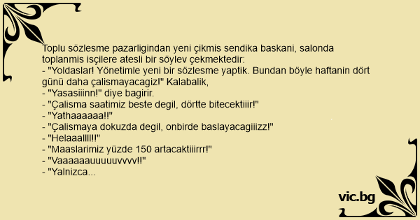 - "Yoldaslar! Yönetimle yeni bir sözlesme yaptik. Bundan böyle haftanin dört günü daha çalismayacagiz!" Kalabalik,