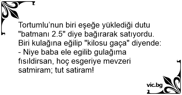 Tortumlu’nun biri eşeğe yüklediği dutu "batmanı 2.5" diye bağırarak satıyordu. Biri kulağına eğilip "kilosu gaça" diyende: