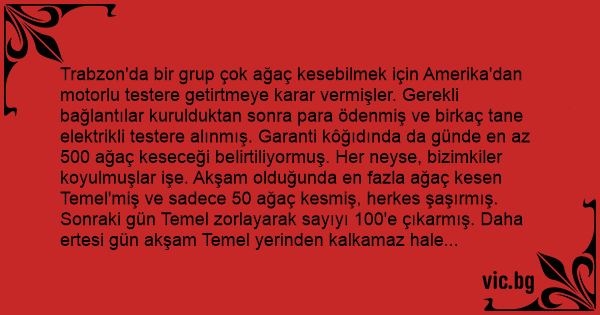 Trabzon'da bir grup çok ağaç kesebilmek için Amerika'dan motorlu testere getirtmeye karar vermişler. Gerekli bağlantılar kurulduktan sonra para ödenmiş ve birkaç tane elektrikli testere alınmış. Garanti kôğıdında da günde en az 500 ağaç keseceği belirtiliyormuş. Her neyse, bizimkiler koyulmuşlar işe. Akşam olduğunda en fazla ağaç kesen Temel'miş ve sadece 50 ağaç kesmiş, herkes şaşırmış. Sonraki gün Temel zorlayarak sayıyı 100'e çıkarmış. Daha ertesi gün akşam Temel yerinden kalkamaz hale gelmiş ama sadece 150 ağaç kesebilmiş. Artık bizimkiler Amerika'dan bir yetkili çağırmaya karar vermişler. Yetkili gelmiş ve birlikte ormana gitmişler. Amerikalı motorun ipini çekip çalıştırmış ve çıkan ses üzerine bizimkiler hep bir ağızdan bağırmışlar: