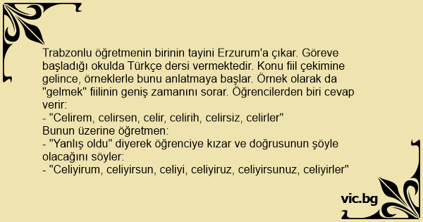 Trabzonlu öğretmenin birinin tayini Erzurum'a çıkar. Göreve başladığı okulda Türkçe dersi vermektedir. Konu fiil çekimine gelince, örneklerle bunu anlatmaya başlar. Örnek olarak da "gelmek" fiilinin geniş zamanını sorar. Öğrencilerden biri cevap verir: